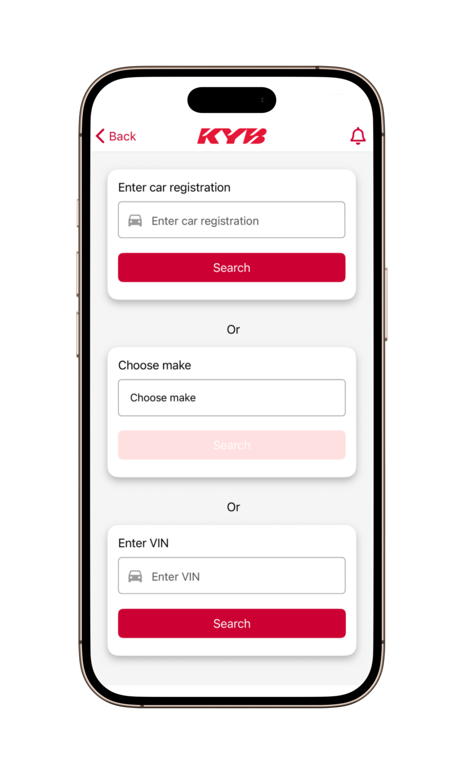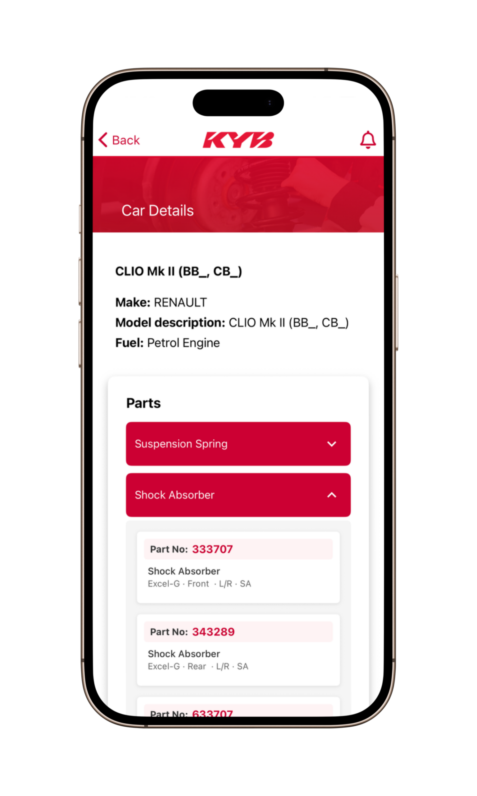 The App then uses TecDoc to show the vehicle details, the KYB parts available for it, and provides a link to any fitting videos we have for that vehicle.
