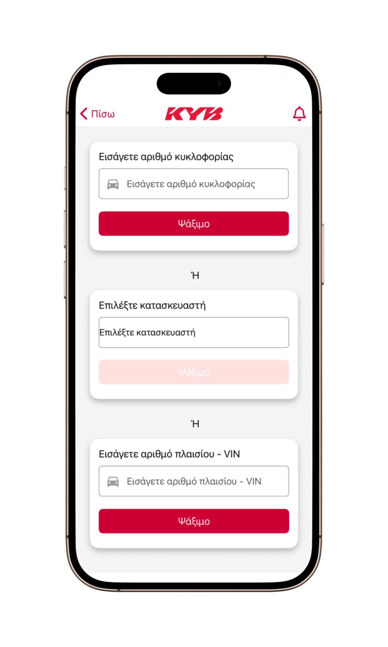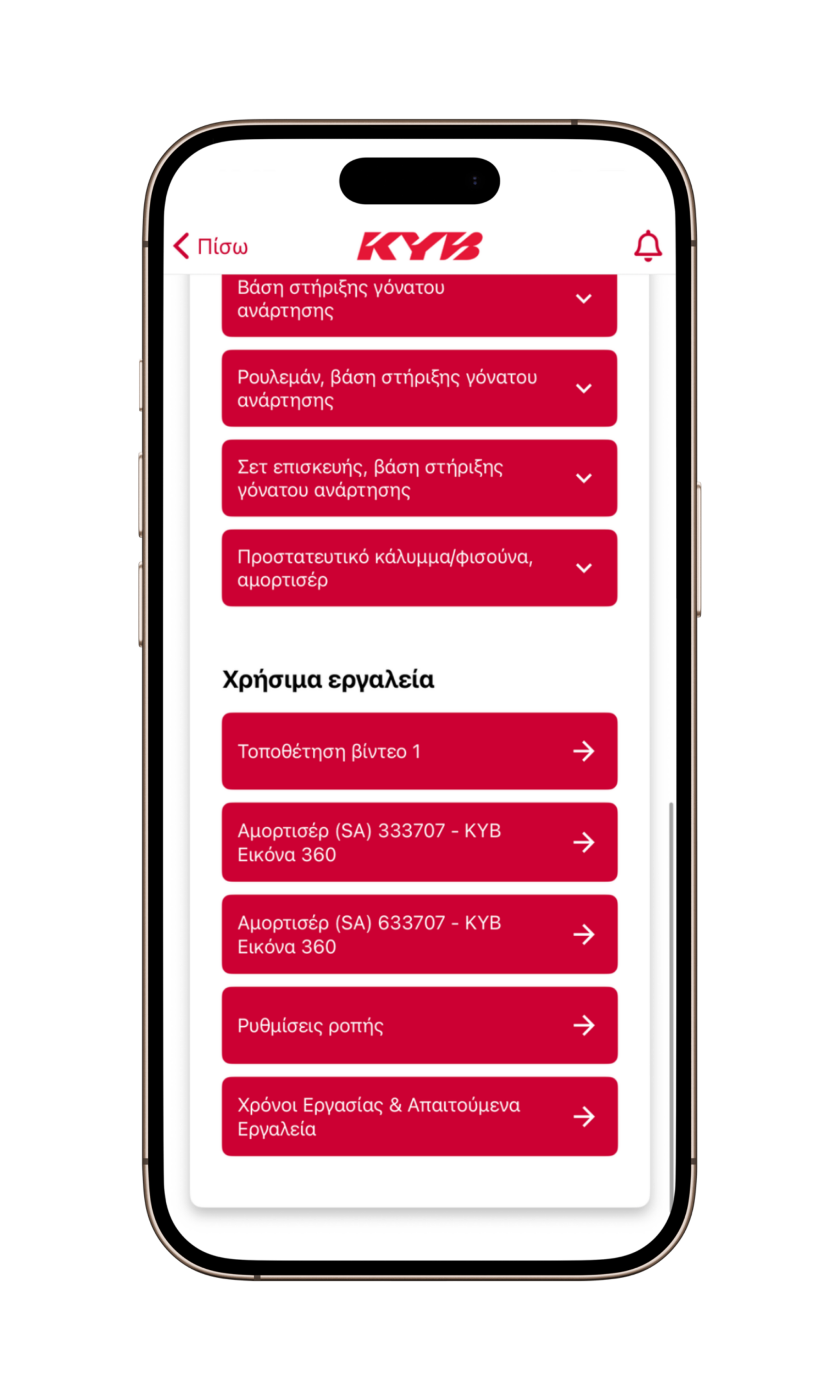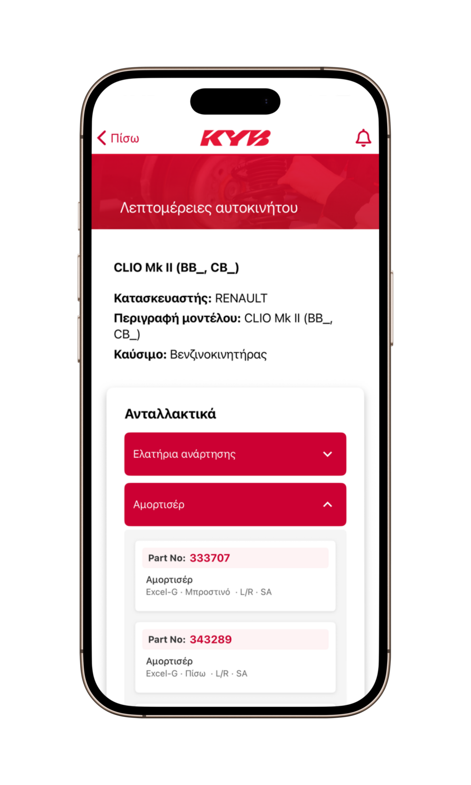 Η εφαρμογή στη συνέχεια χρησιμοποιεί τον TecDoc για να δείξει τις λεπτομέρειες του οχήματος, τα διαθέσιμα εξαρτήματα της KYB για αυτό, και παρέχει έναν σύνδεσμο για όποιο βίντεο τοποθέτησης έχουμε για το συγκεκριμένο όχημα.