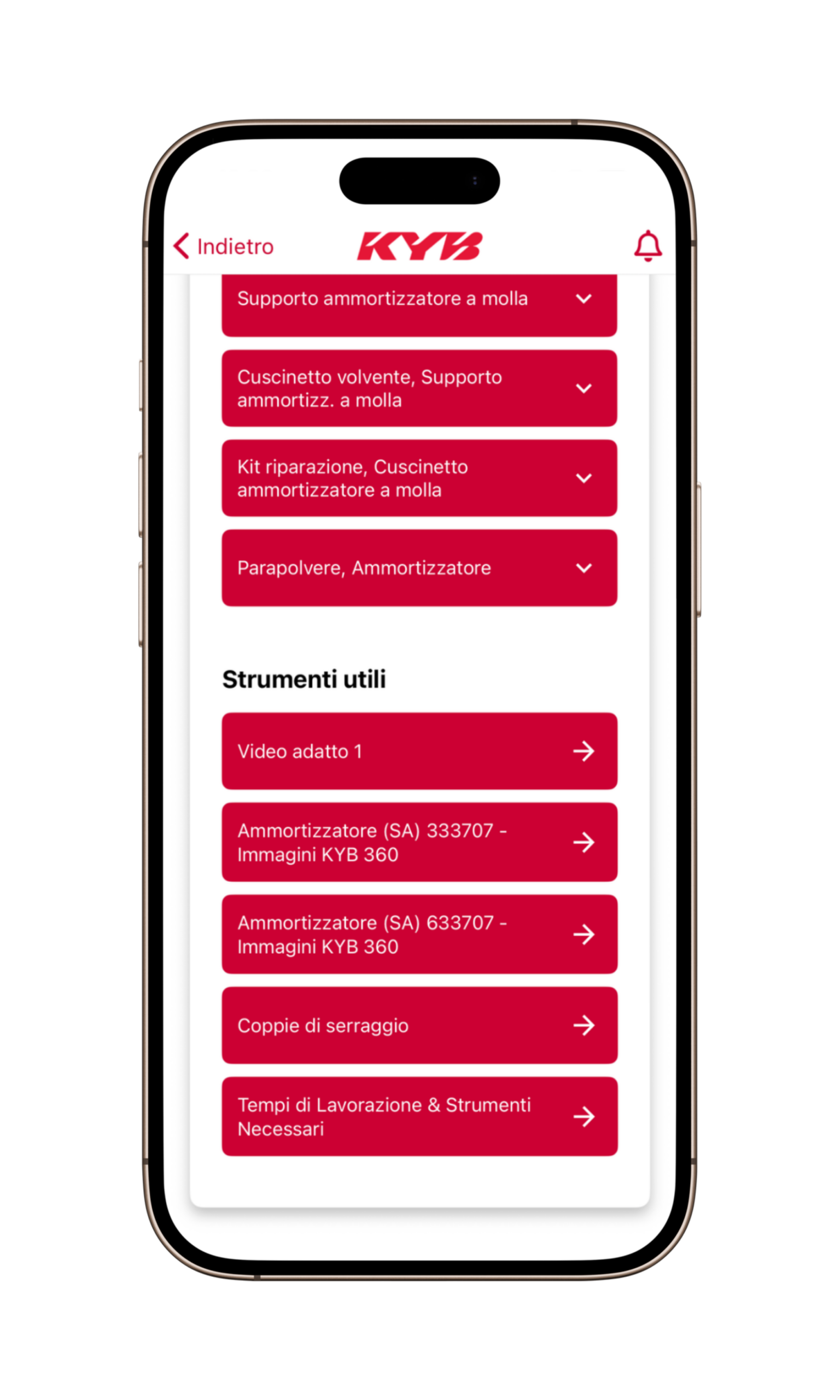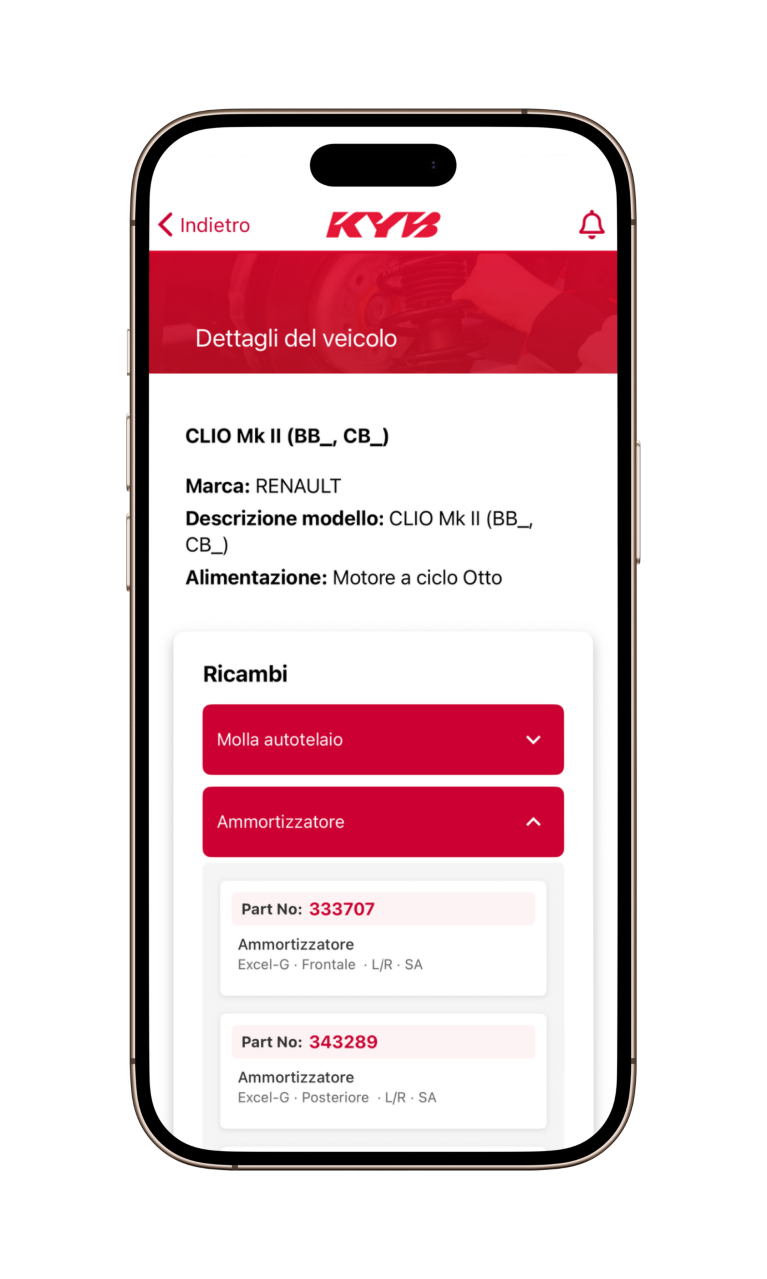 L’App utilizza TecDoc per mostrare i dettagli del veicolo, i componenti KYB disponibili per lo stesso e fornisce un link a qualsiasi video di montaggio che abbiamo per quel veicolo.