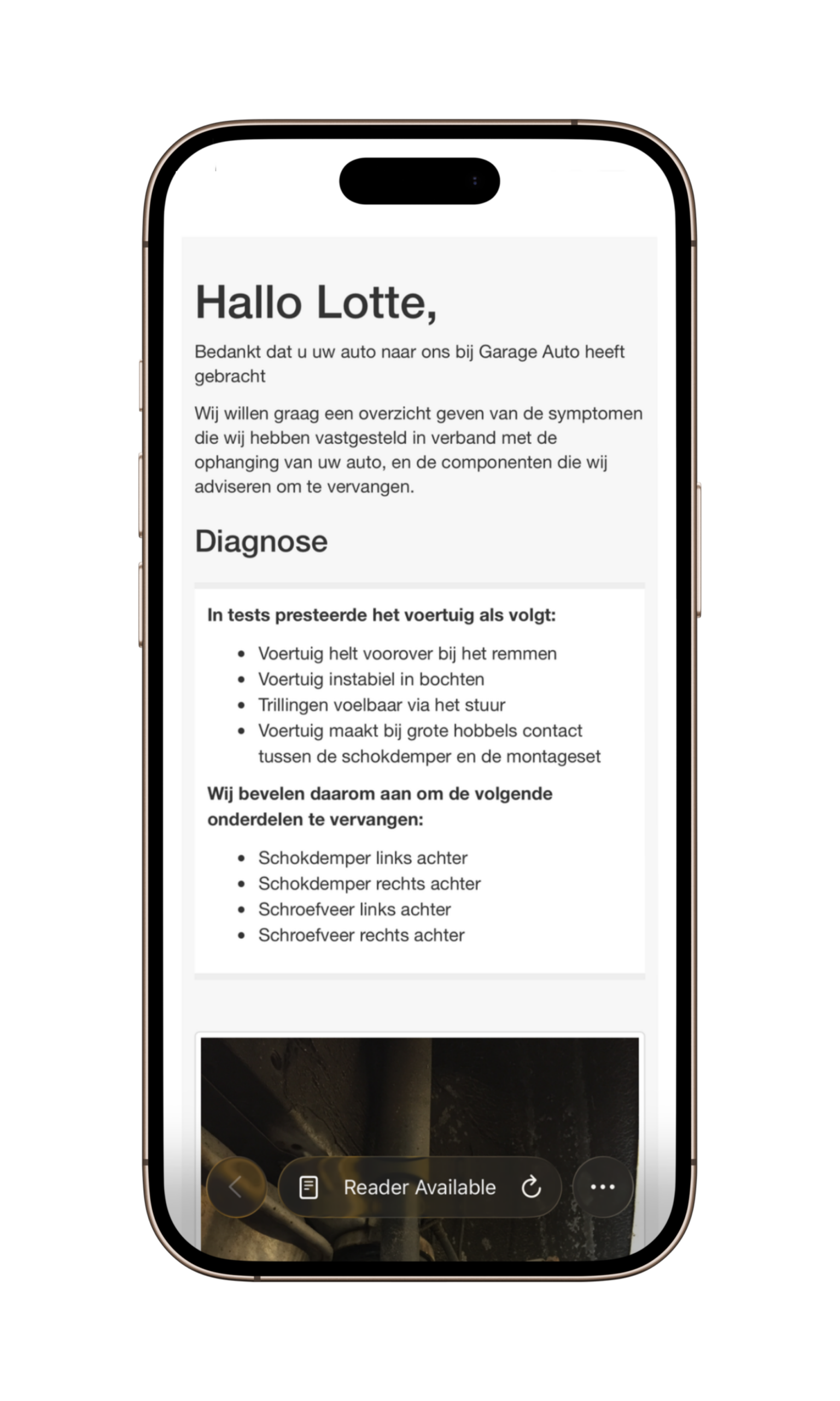 Het rapport is voorzien van het logo van de garage en persoonlijk gericht aan de automobilist.