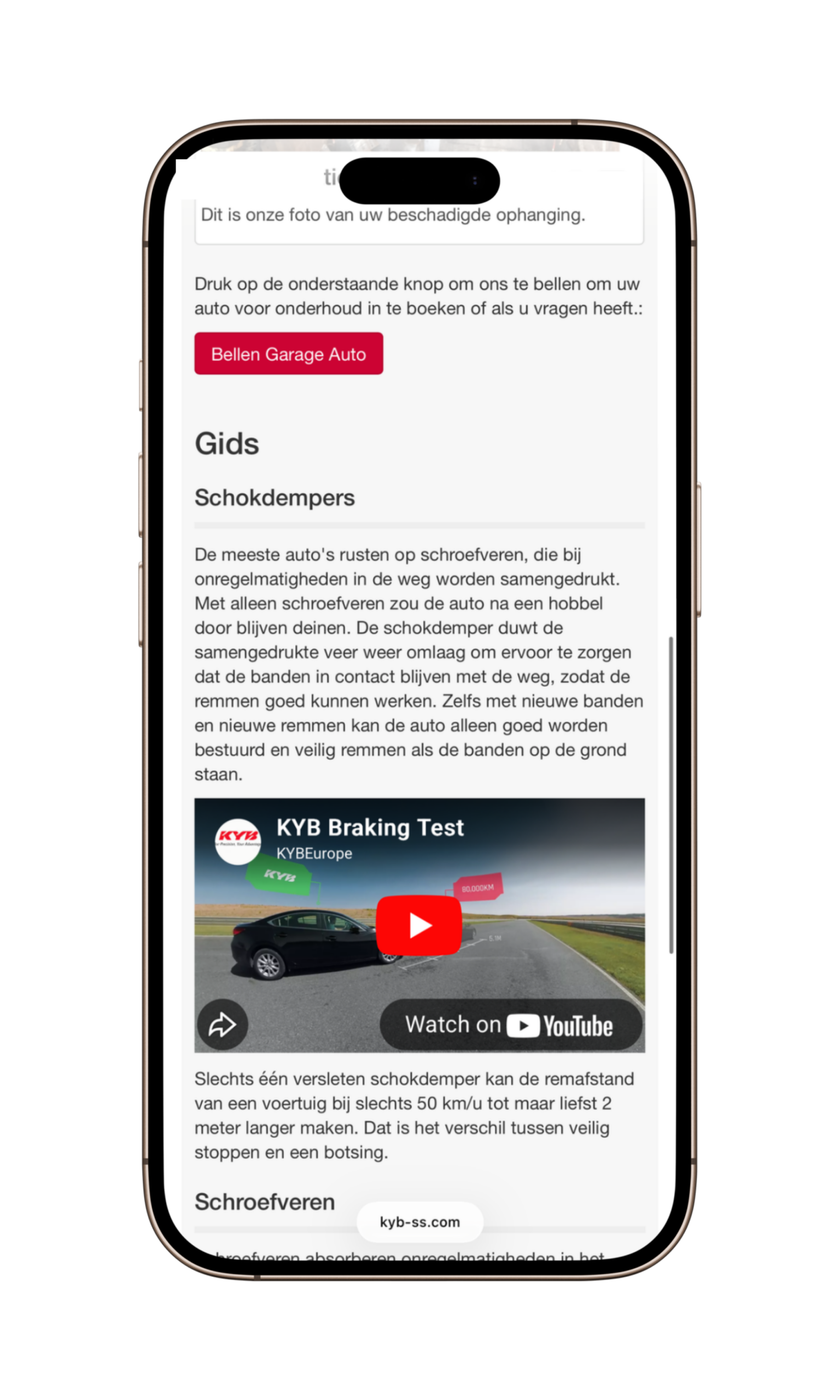 De app gebruikt vervolgens TecDoc om de voertuigdetails te tonen, de KYB-onderdelen die voor het voertuig beschikbaar zijn en een koppeling naar de eventuele montagevideo’s die we voor dat voertuig hebben.