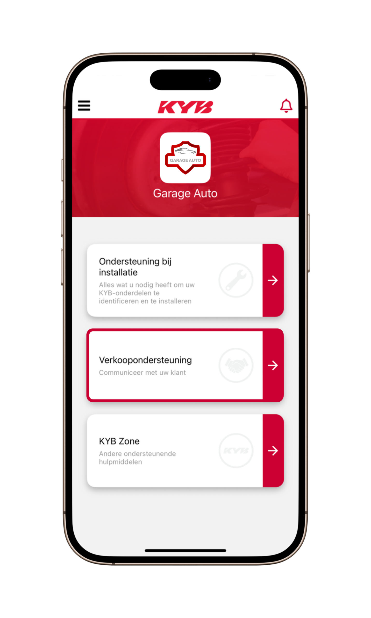 De app helpt u nu bij het vinden en monteren van KYB-producten, en ondersteunt u bovendien bij communicatie en verkoop.
