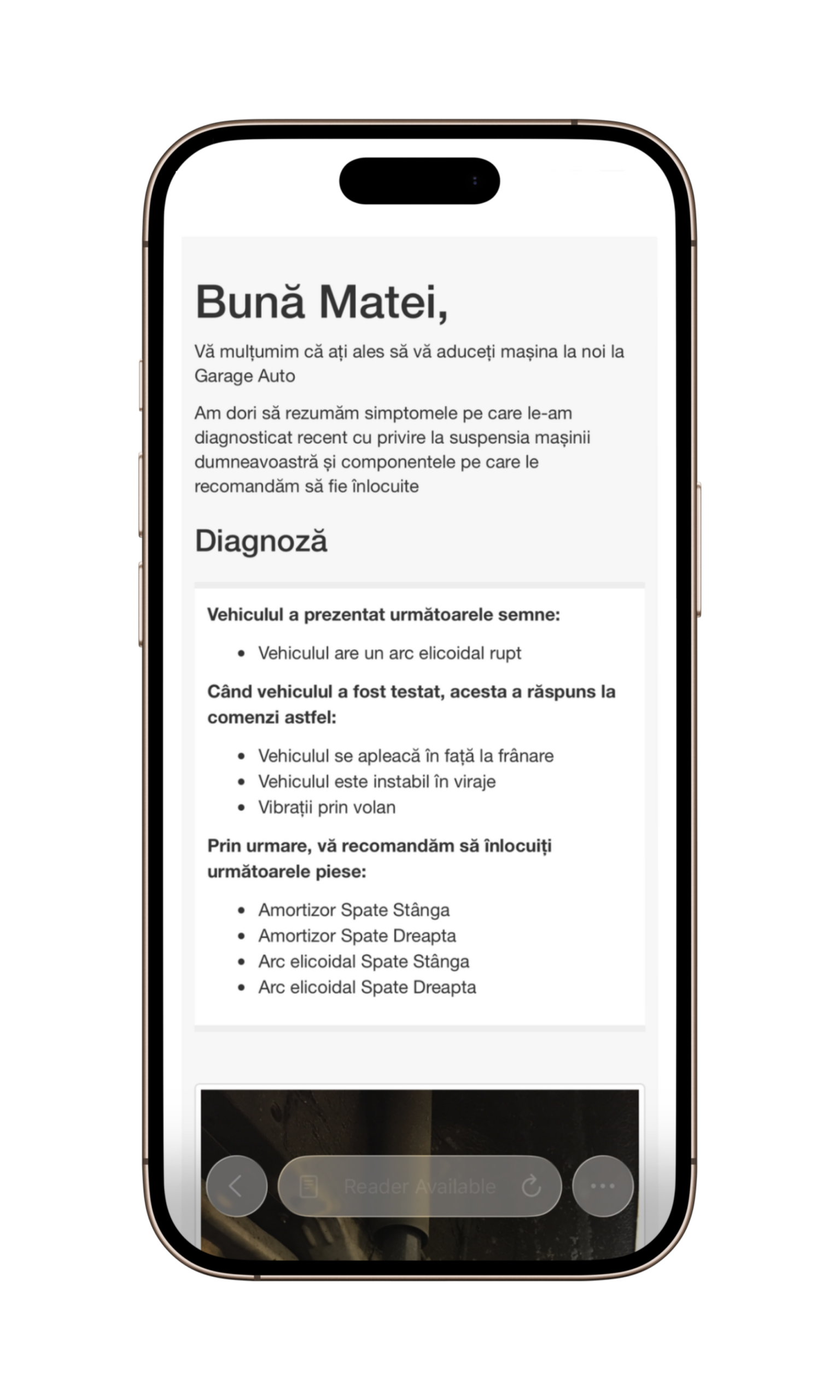 Dacă ai finalizat recent lucrări la suspensia unui vehicul și dorești să arăți clientului lucrările efectuate, selectează „Raport de finalizare”.