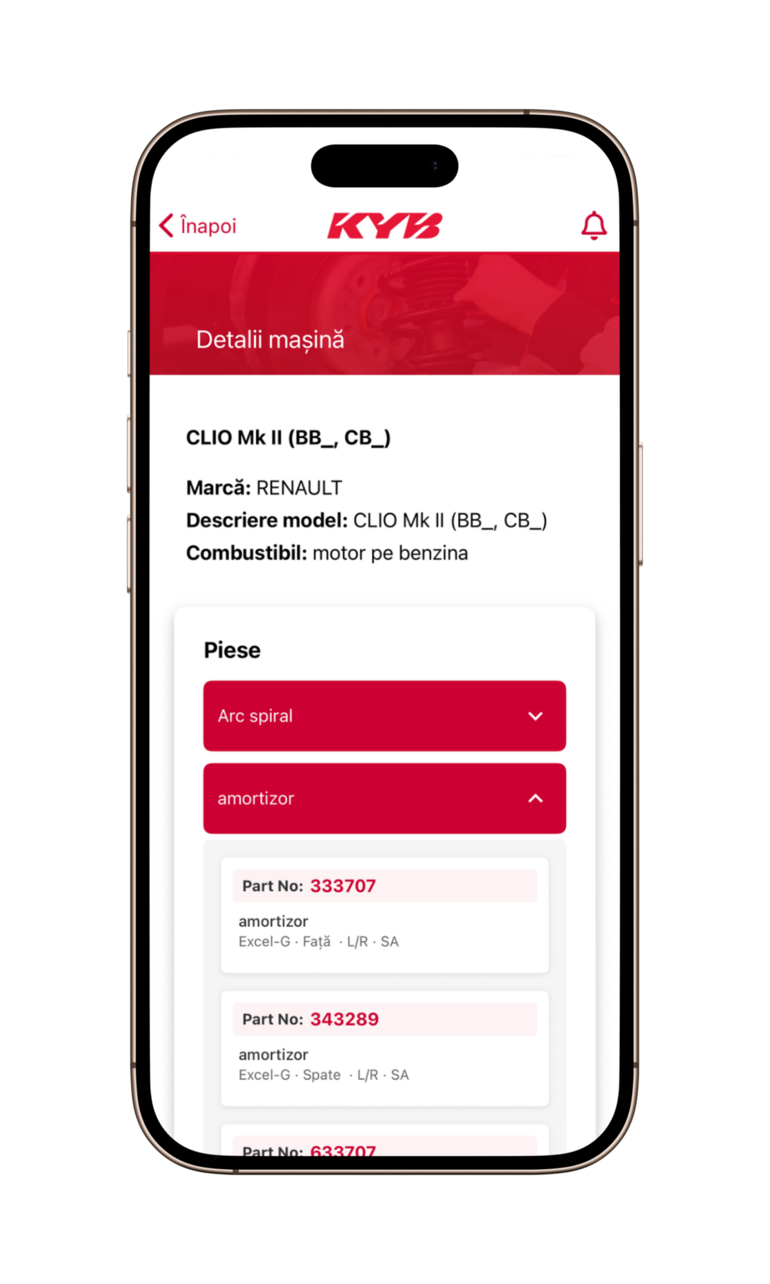 Aplicația folosește apoi TecDoc pentru a afișa detaliile vehiculului, codurile KYB disponibile pentru acesta și oferă un link către videoclipurile existente, pe care le avem pentru vehiculul respectiv.
