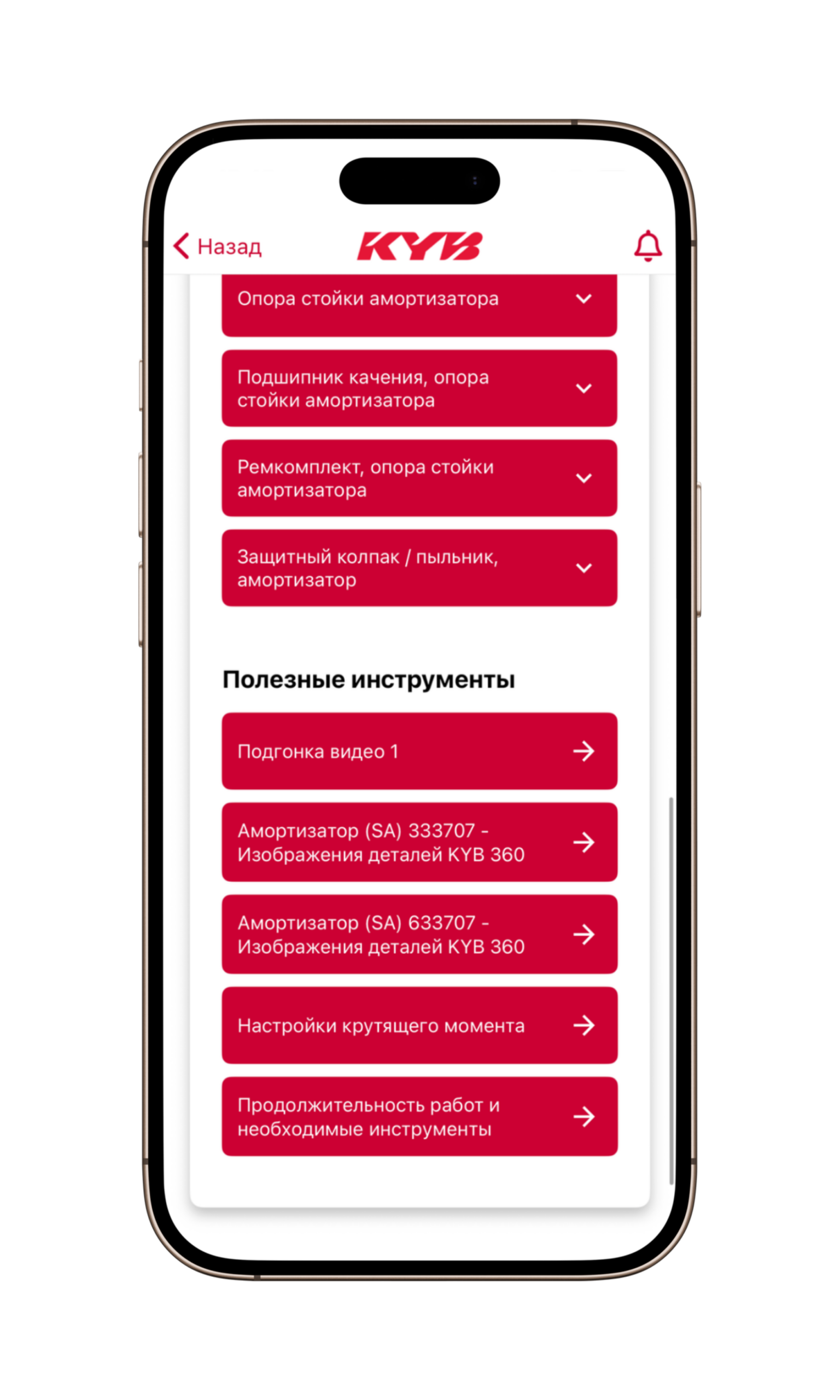 Мобильное приложение использует электронный каталог TecDoc при подборе нужной детали KYB и предлагает видео по монтажу, если таковое имеется для данной модели.