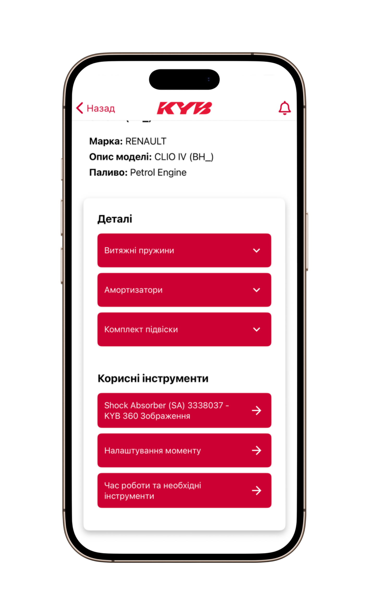 Мобільний додаток використовує електронний каталог TecDoc, щоб підібрати коректні деталі KYB, і надає посилання на відео по монтажу, якщо є для даної моделі.